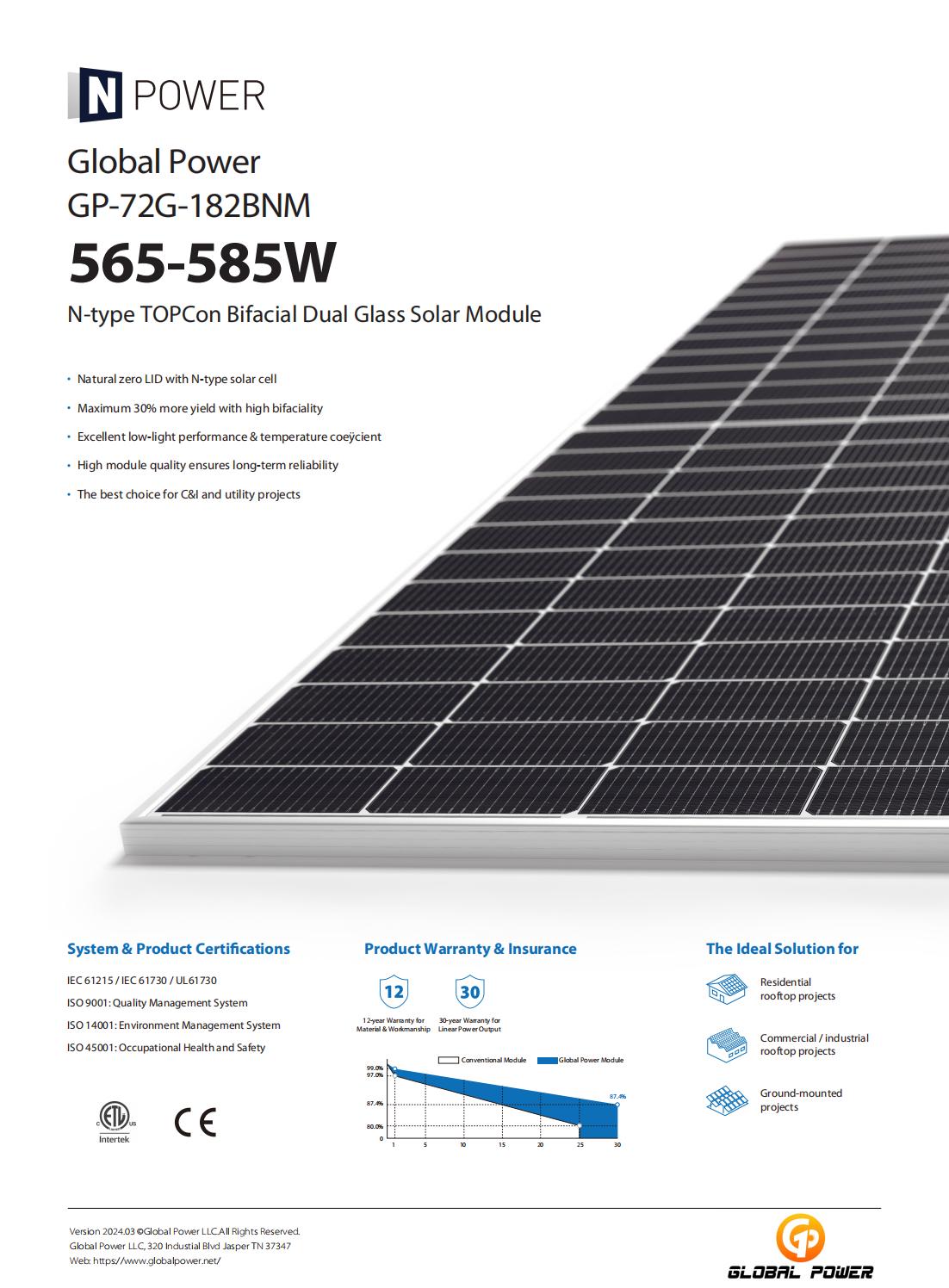 GP-72G-182BNM 565-585W N-type TOPCon Bifacial Dual Glass Solar Module